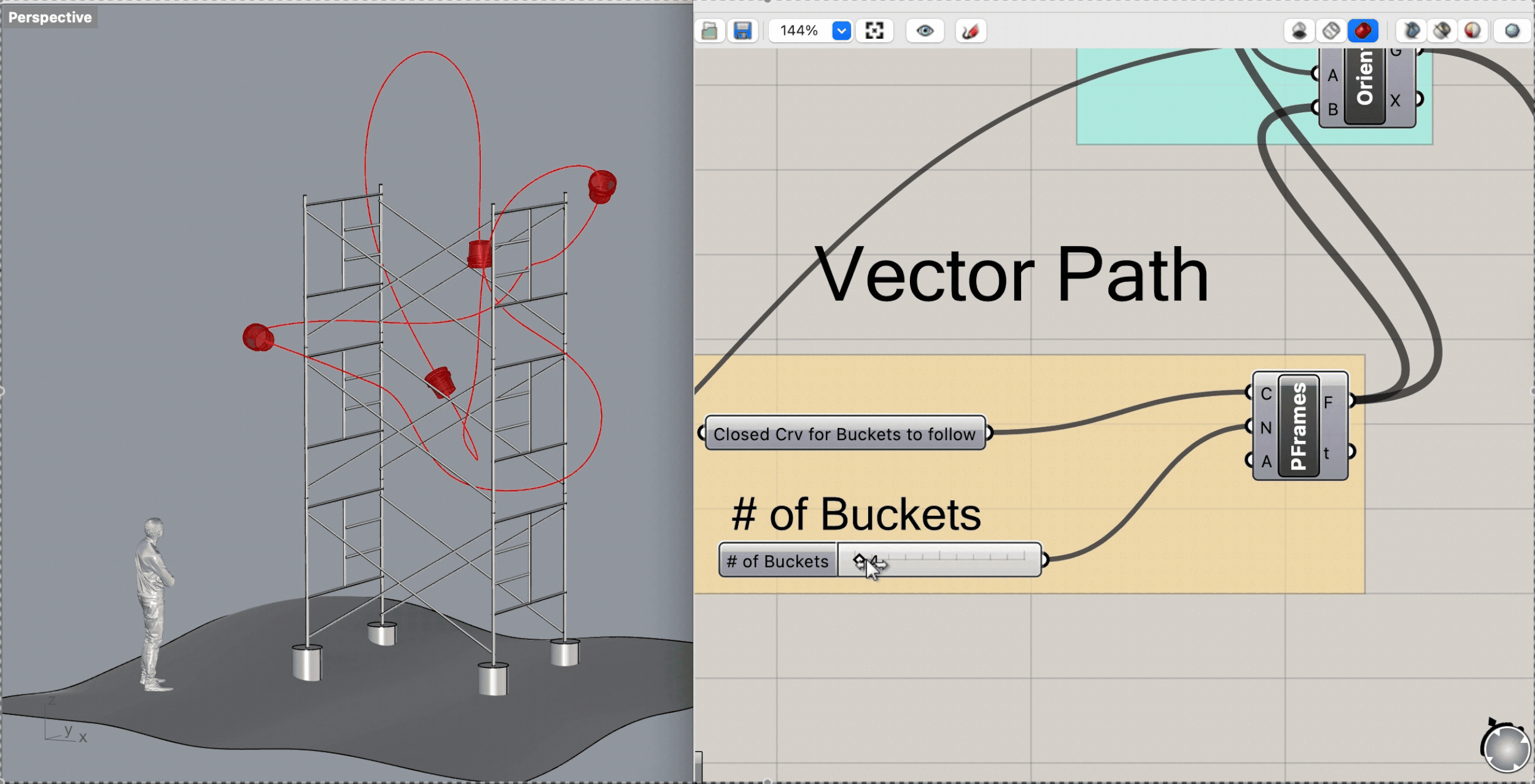 To support Jason’s creative vision, I used Rhino 3D along with Grasshopper to streamline the design process. I built a parametric definition that allowed a sequence of buckets to follow a user-defined path in 3D space. Each bucket was automatically oriented so that its base remained perpendicular to the curve, maintaining a clean and intentional alignment throughout the structure.