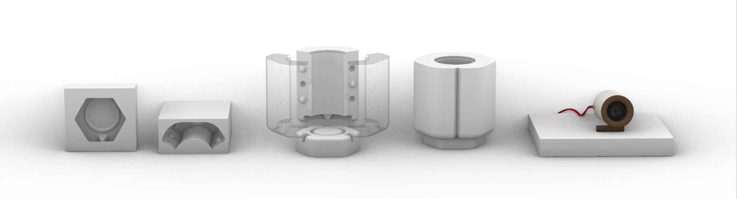 To address the inconsistencies of the first two versions—particularly the variation in internal volume from hand-thrown vessels—I explored slip casting as an alternative ceramic forming method. This technique uses plaster molds to produce consistent forms, which is critical for achieving reliable acoustic performance in sealed enclosures. I designed a four-part mold in Rhino 3D, 3D-printed the master, and cast it in silicone to create durable, repeatable plaster molds. Since plaster deteriorates with use, the silicone master ensures I can regenerate identical molds as needed.